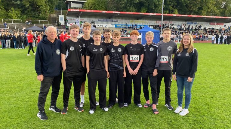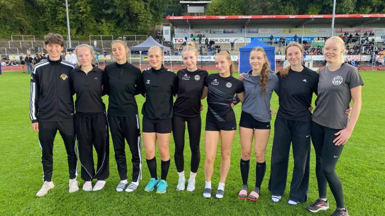 „Wenn man bei den Finalkämpfen von Westfalen zwei Mannschaften am Start hat, und diese die Plätze 1und 2 in ihren jeweiligen Klassen belegen, dann darf man mit Fug und Recht von einer eindrucksvollen Vorstellung unseres Nachwuchses sprechen“, berichtet Klaus Brand aus dem sauerländischen Kreuztal-Stadion in Olpe. Und es waren bei dieser letzten FLVW-Meisterschaft der Saison in allen Altersklassen spannende Kämpfe, die oft erst in der letzten Disziplin entschieden wurden. Die zahlreich vertretenen Eltern hatten ihren Spaß und gaben engagierte Fan-Unterstützung. Hart umkämpft war die Gruppe 2 der wU18. Nach 7 Disziplinen lagen mehrere Teams nur wenige Punkte auseinander. Bis dahin hatten für die Startgemeinschaft Minden/Lippe-Süd Katharina Schnabel 13,00s über 100m gelaufen und 5,17m weit gesprungen, Greta Spieß 31,39m mit dem Speer geworfen, 5,16m weit gesprungen oder Berit Ringel 1,48 hoch gesprungen, und die 4x100m Staffel mit Spieß-Schnabel-Koch-Essing sehr gute 51,56s gelaufen. Die 2:39,93 und 2:48,71min von Marla Koch und Karolina Essing brachten die ganz knappe Entscheidung mit einer Steigerung um 310 Punkte auf Platz 1 mit 7181 Punkten vor LAZ Regio Herford mit 7158 Punkten, sehr zur Freude von Coach Michael Striewe. Die mU16-Mannschaft der LG Lippe-Süd unter Klaus Brand und Jannika Hoffinger lieferte der zum Schluss siegreichen TV Werne 03 einen tollen Kampf: Wolf Kröger lief 13,07 s über die Hürden, Julian Krüger sprang 1,60m hoch und stieß die Kugel 11,65m weit, Ben Krome schleuderte Speer und Kugel auf 37,15 und 12,79m, Oskar Diestelmann überquerte 1,56m im Hochsprung, Tim Peine 9,70m Kugel oder die 4x100m-Staffel mit Striewe-Kröger-Linus Pöhl-Pepe Reichinger kam auf 51,62s. Die 800m erbrachten tolle Zeiten für Paul Striewe in 2:25,27 und Wolf Kröger in 2:33,35min, doch die 2:16 sind 2.17min von Werne waren nicht zu schlagen, daher Platz’ 2 für die LG Lippe-Süd mit 7990 Punkten (eine Steigerung von 178 Punkten) hinter Werne mit 8253 Punkten.