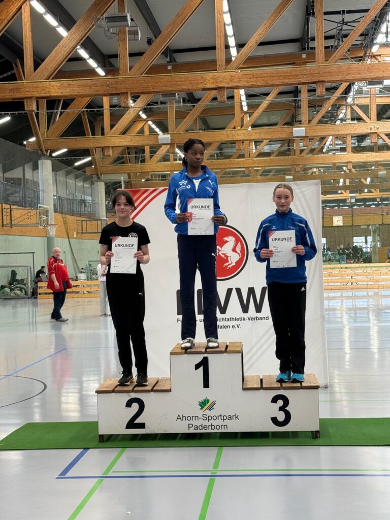 Am zweiten Tag im Paderborner Ahorn-Sportpark gab es eine ganz überragende Ausbeute: 17x Platz 1, 11x Platz 2 und 8x Platz 3 und viele neue persönliche Bestleistungen ließen kaum Wünsche offen! Wolf Kröger war in M15 sogar viermal ganz oben: Hochsprung 1,70m,. 60mHürden 9:45s, Stabhoch 2,70m und mit der 4x200m-Staffel zusammen mit Paul Striewe, Ben Krome und Lukas Hülsmann in 1:45,50min. Ebenfalls viermal kam Greta Spieß in W15 viermal auf das oberste Treppchen: 60m in 8,08s, Weitsprung 5,17m, Kugelstoß 10,45m und mit der 4x200m-Staffel Stg. Minden/Lippe-Süd in 1:56,65m mit Hanna Mellies als Schlussläuferin. Ben Krome haute im Kugelstoß M15 „mächtig einen raus“: 13.88m bedeutete Platz 1 in Westfalen – außerdem sprang er 1,58m hoch und verwies damit Oskar Diestelmann mit 1,54m auf Platz 3. Westfalenmeisterin Emma Bösebeck-Singh gewann deutlich den Stabhochsprung W14 mit 3,50m vor Leila Nurilinna mit 2,60m, verfehlte allerdings aussichtsreich einen neuen Westfalenrekord von 3,61m. Weitere neue Titelträger: Paul Striewe über 800m M15 in 2:28,02min, Jakob Schlieker über 60mHürden M14 in 10,93s, Johann Viehrig derHochsprung und Stabhochsprung M12 mit tollen 1,43m und 2,20m dominierte, Emilia Krüger über 60mHürden W13 in 10,61s und im Stabhochsprung Maximilian Buxe in M12 mit 1,90m und in W13 Merle Driedger mit 2,50m.