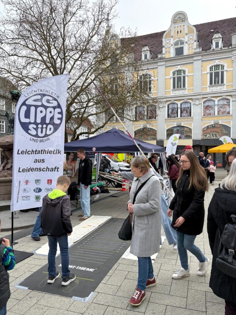 Zum Frühlingsfest in Detmold sind – vor allem bei schönem Wetter – Jung und Alt unterwegs, um zu shoppen oder einfach zu flanieren. Dieses Jahr mit einem Stand dabei: die LG Lippe-Süd. Zentral auf dem Marktplatz Detmold hatte man einen Pavillion, Banner mit Linda Stahl, Desiree Singh und Tina Rother und eine LG-Flag aufgebaut, LA-Geräte präsentiert und eine „Standweitsprung-Anlage“ zum Mitmachen vorbereitet. Und dort herrschte über 5 Stunden ein enormer Betrieb, denn mehr als 100 Teilnehmer – darunter Bürgermeister Frank Hilker, KSB-Präsident Friedhelm Böger, Sportverbandchef Carsten Lamm oder die frühere Ministerin Ute Schäfer und etliche politische Prominenz machten den Spaß mit, neben vielen Kindern, Jugendlichen und Eltern. Daneben wurden viele Interessierte über unser sportliches Wirken und Trainingszeiten informiert und dem Radio Klüt sogar ein Interview gegeben (Nachschauen auf Instragramm!) „Nebenbei“ konnte für ein großes Event am 19.7.26 geworben werden, wenn auf dem Marktplatz ein öffentliches Showspringen der Stabhochsprunggruppe veranstaltet werden soll, wobei Anlage und spezielle Anlaufbahn extra installiert werden wird.